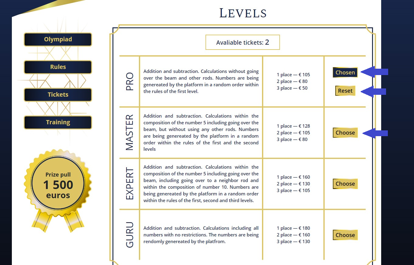 After practicing on the platform you can choose more levels to participate in. The maximum number of levels is four. If you buy several tickets, you cannot participate in one level twice.