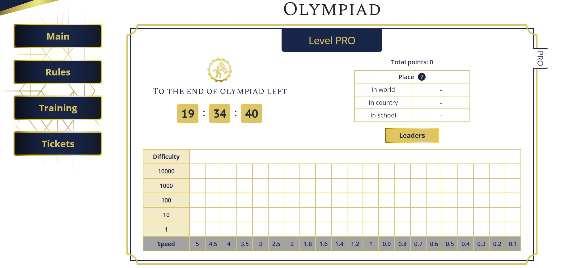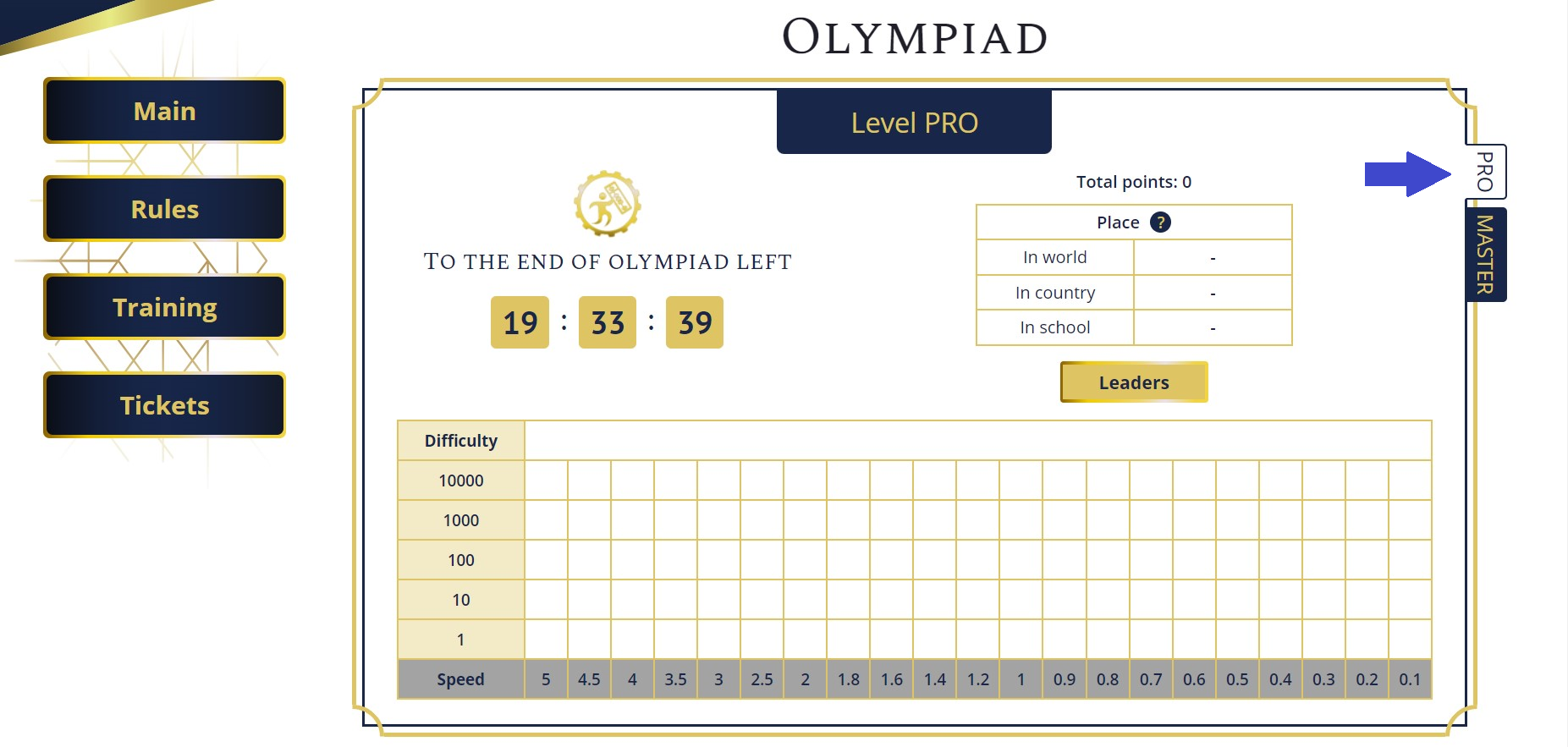 Olympiad tasks will be available on the main page of the student account. For example, you want to start participation in the Olympiad with difficulty 10 (two-digit) and a speed 0.9 sec. You click on the square at the intersection of these values and immediately get into the game, by passing the settings page, as these settings are already set. Pay attention to the tabs on the right. On the screenshot you can see that the "PRO" tab is active. This means that the Olympiad page for the "PRO" level is open.
