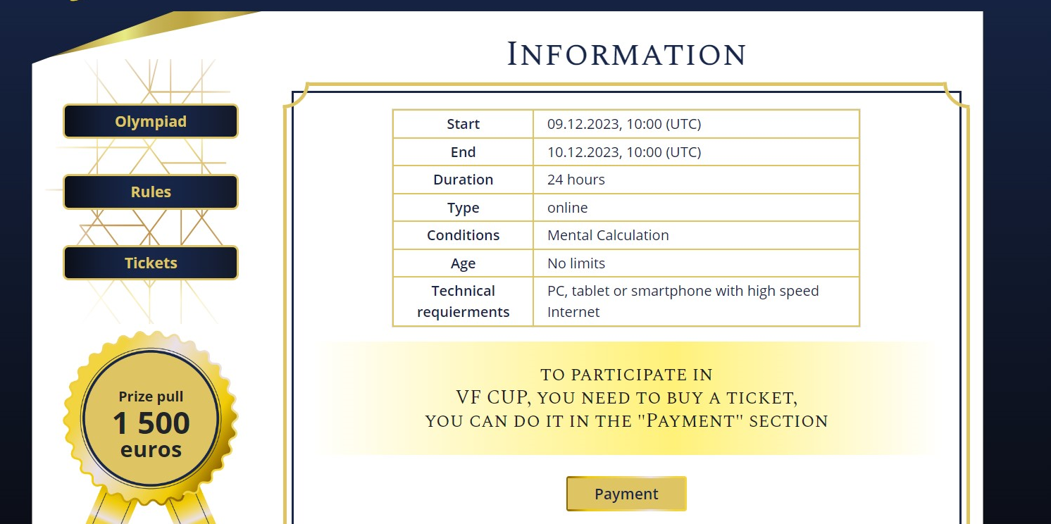 In order to gain access to the Olympiad and training on the VF CUP platform, you need to pay a registration fee: